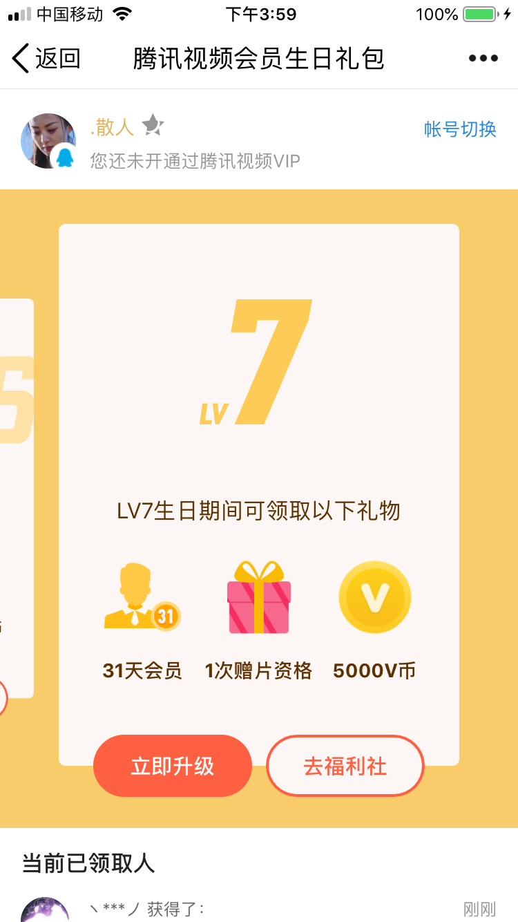 免費領騰訊視頻會員 進去活動生日填今天即可領取 (需要自己有騰訊視頻會員 每人限領一次)