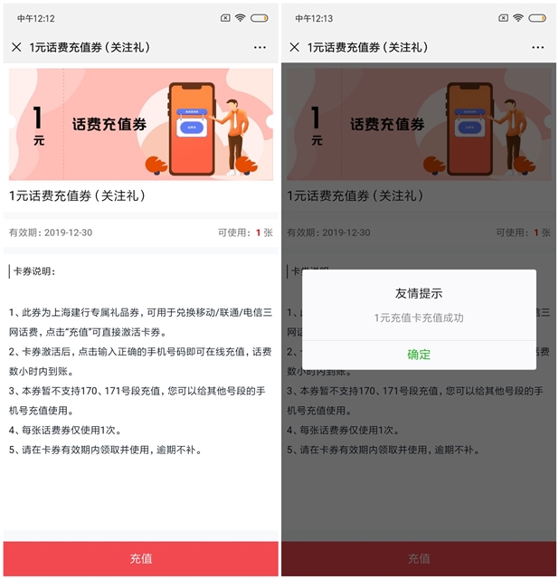 領(lǐng)1元三網(wǎng)話費秒到 上海建行關(guān)注領(lǐng)話費微信搜公眾號“上海建行”關(guān)注公眾號后 右下角菜單欄點擊進入“關(guān)注領(lǐng)話費”然后綁定手機后領(lǐng)取話費1元充值秒到 數(shù)量有限速度上