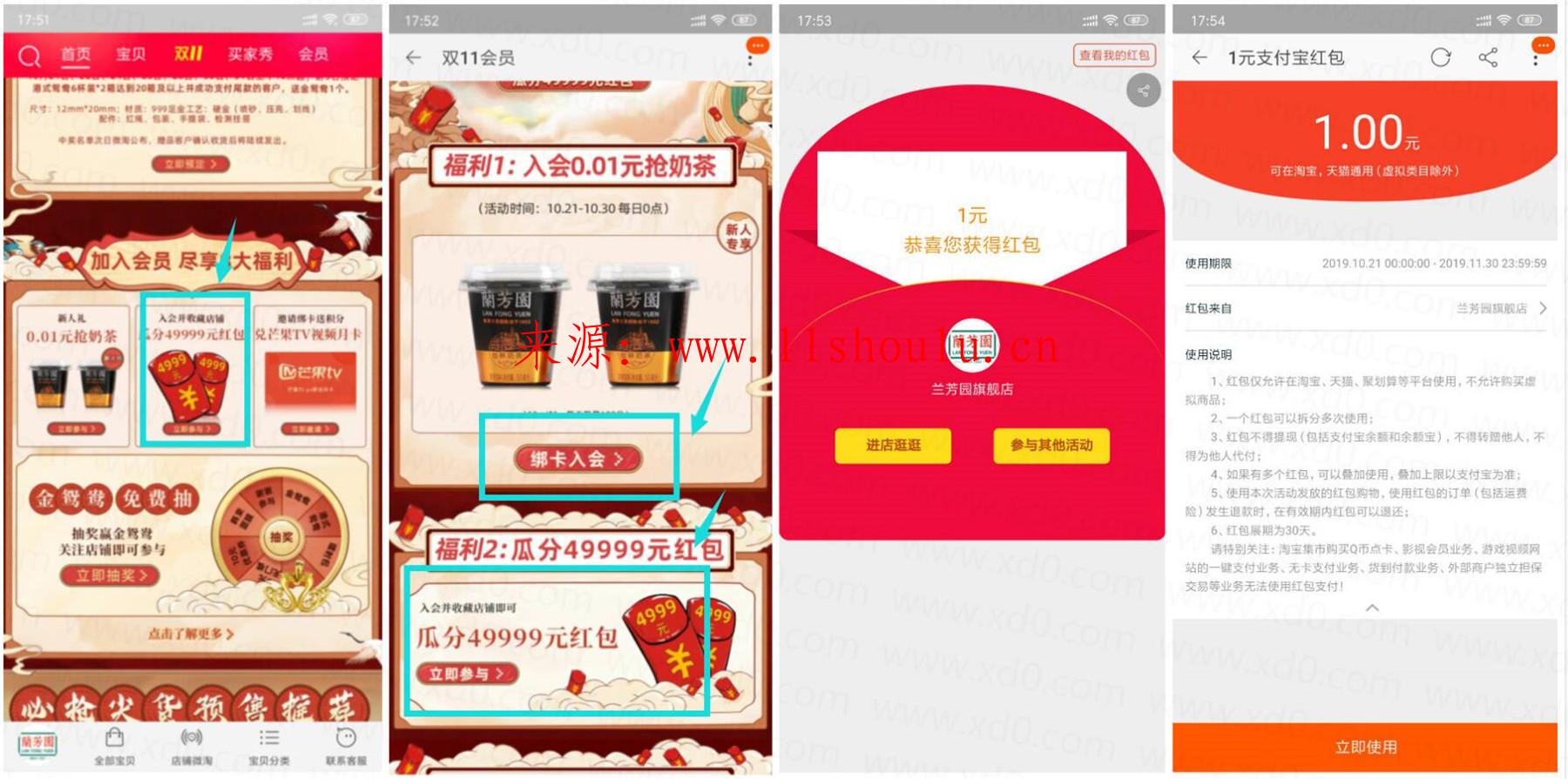 下拉頁面中間->瓜分紅包->進去后先點入會->開通后返回->下拉頁面->立即參與->收藏店鋪->領紅包