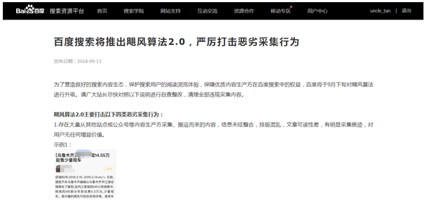 為了創建一個良好的搜索內容生態系統,保護搜索用戶的搜索和瀏覽體驗,并保護百度搜索中高質量內容生產者的權利,百度將在9月下旬升級颶風算法。